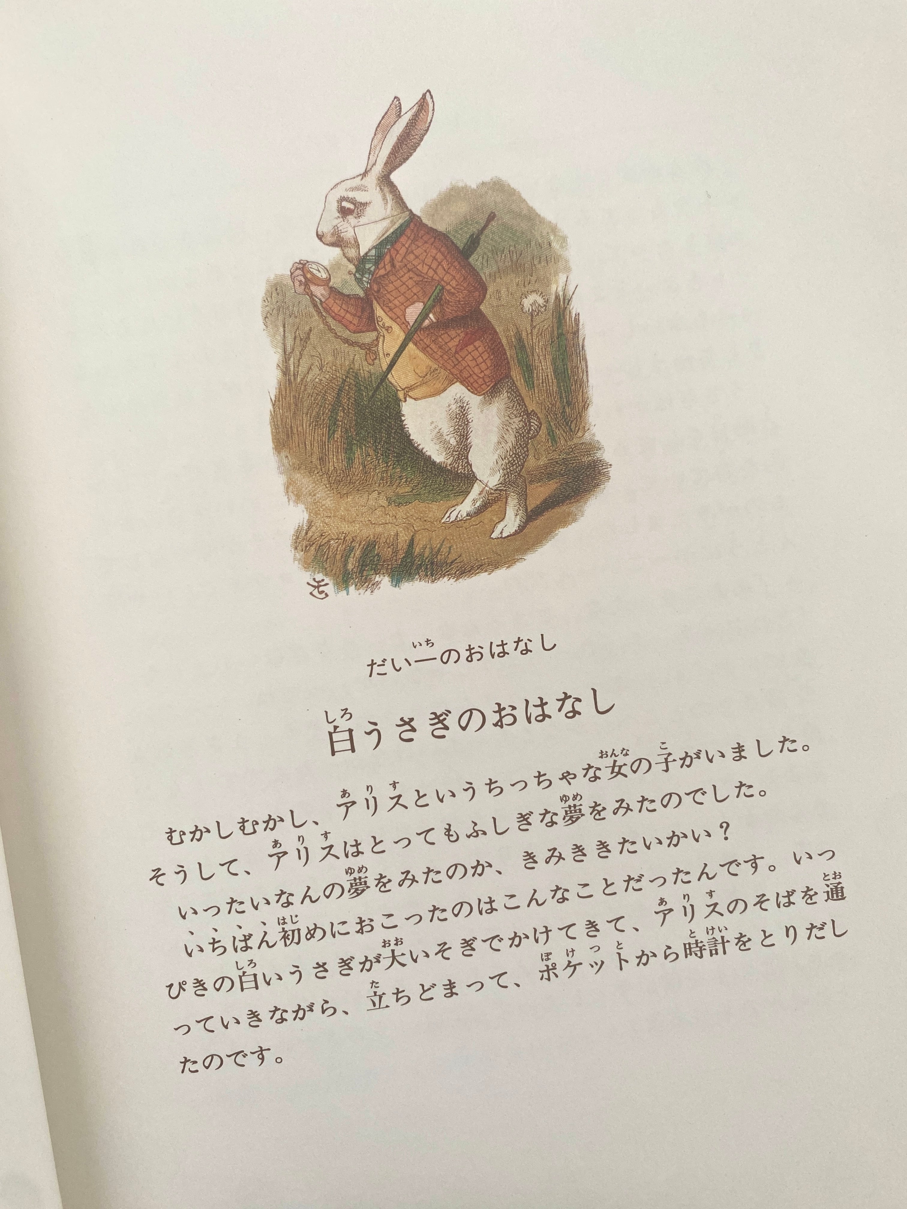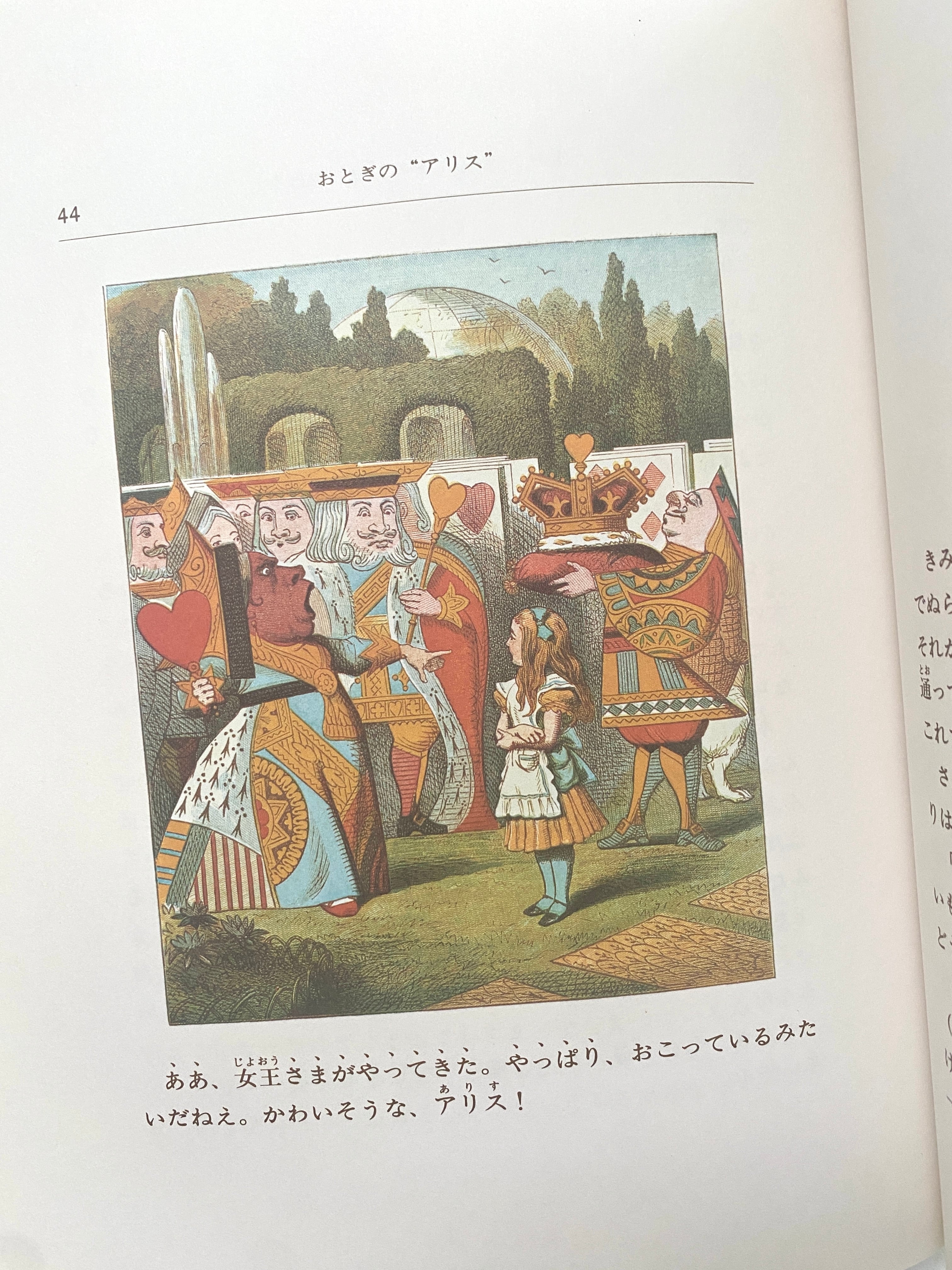 おなじみのジョン・テニエルの挿絵も絵本として見やすいようにと、選ばれた数枚を拡大し色をつけ、テニエル自身の手によって少し描きかえられているそうです。