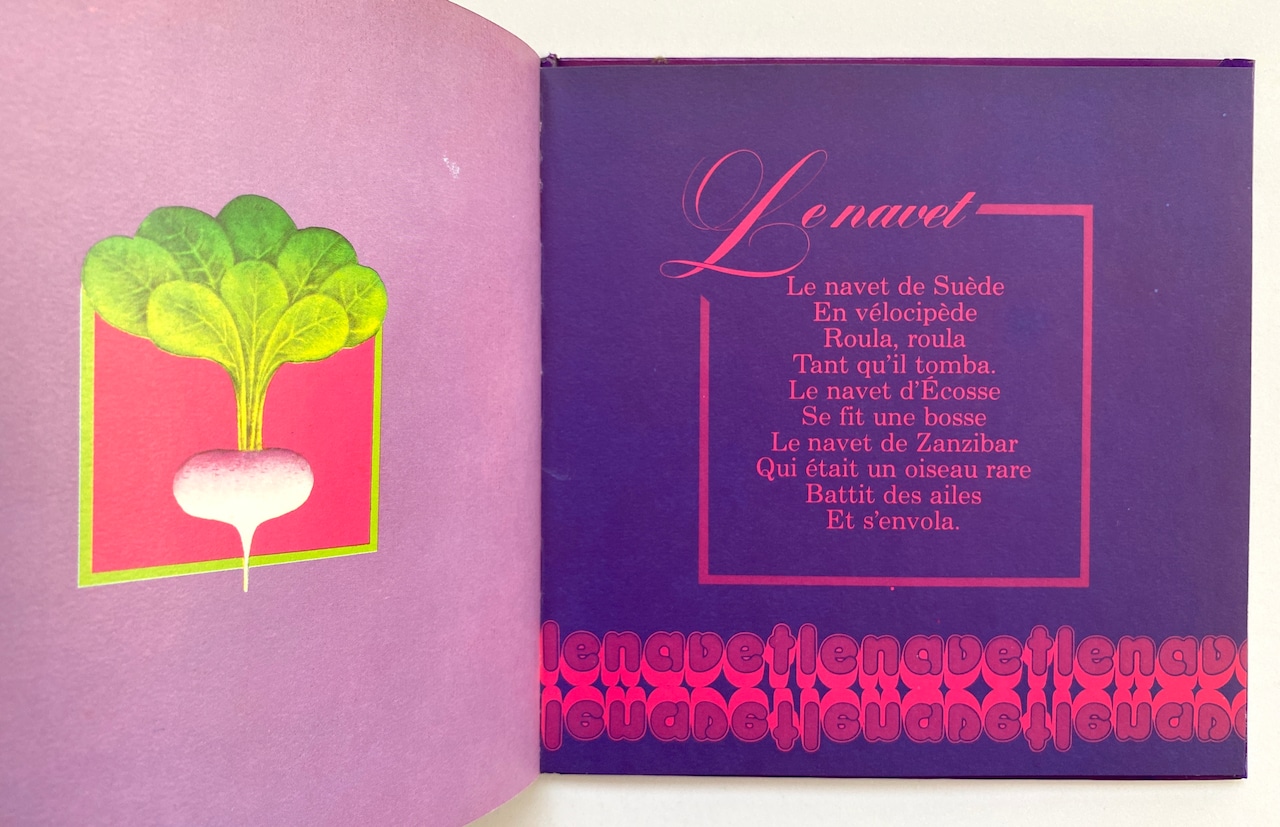 1ページごとに野菜が描かれ、その隣のページにはその野菜をテーマにした詩のようなものが載っています。