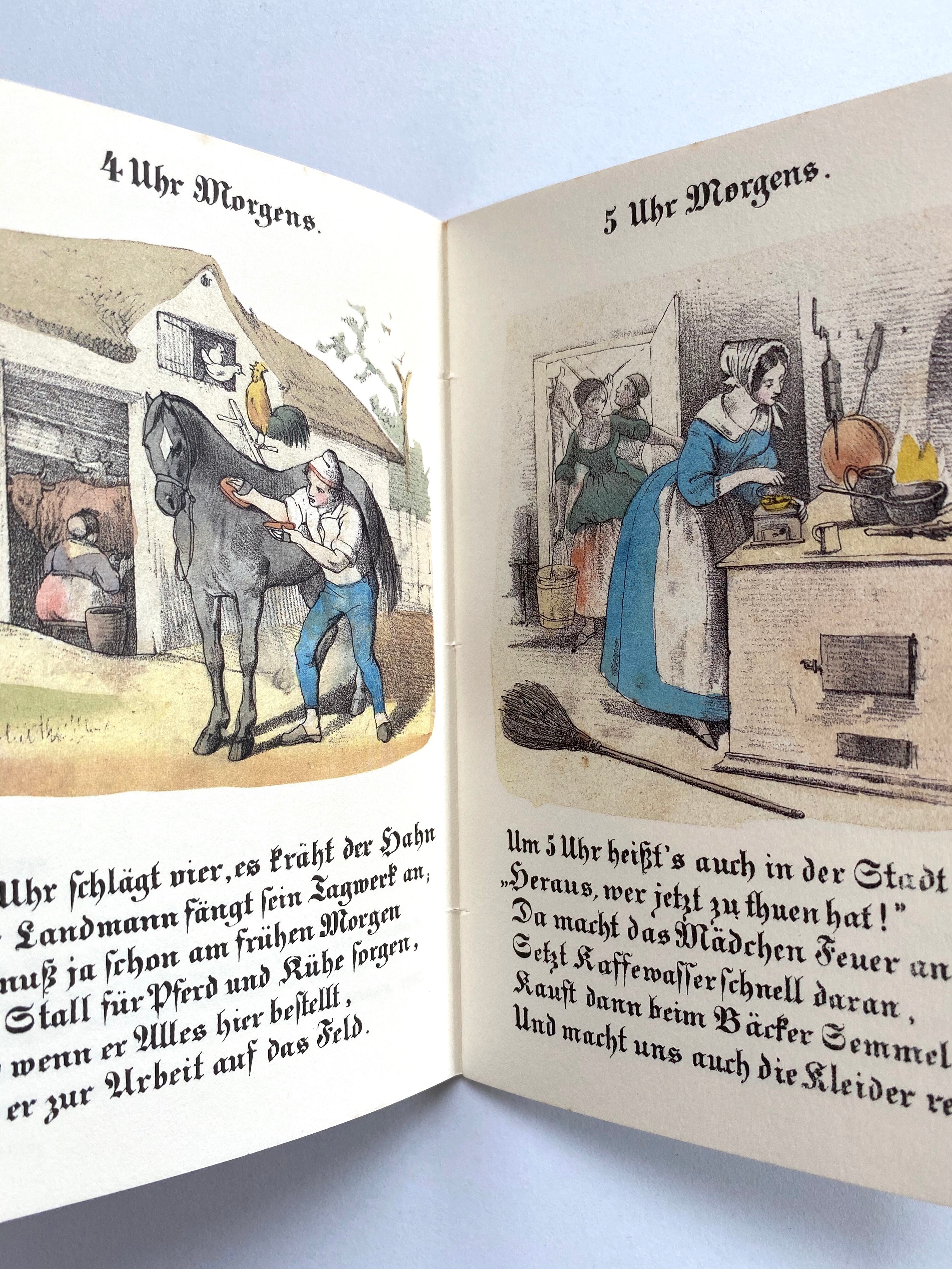子どもたちに1日の時間の経過を教えるための本で、早朝から真夜中までのある時間帯の出来事が12枚にわたって描かれています。
